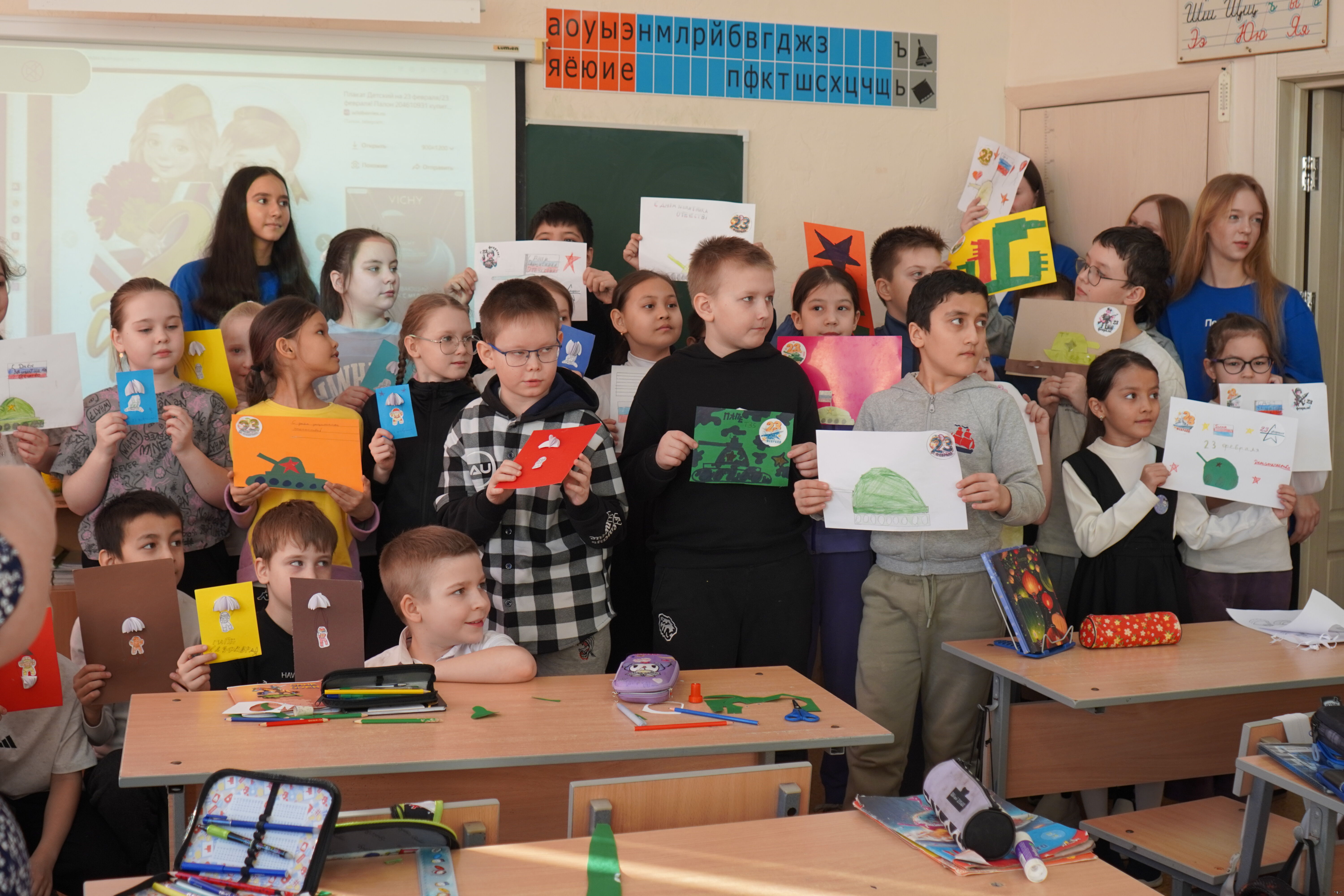 В преддверии Дня защитника Отечества, Совет первых совместно с активистами движения первых 8б класса, советником школы подготовили, организовали и с радостью поделились своим творческим опытом с младшими товарищами из "Орлят России" : провели увлекательный мастер-класс, посвященный изготовлению праздничных открыток.